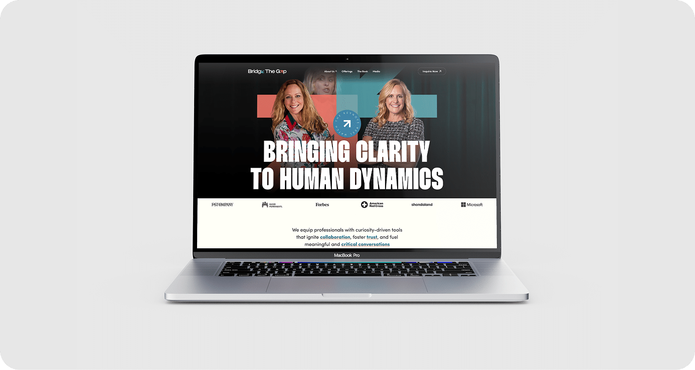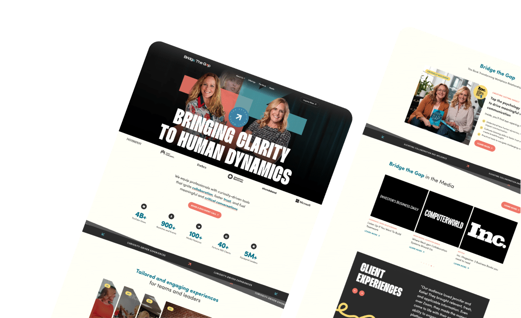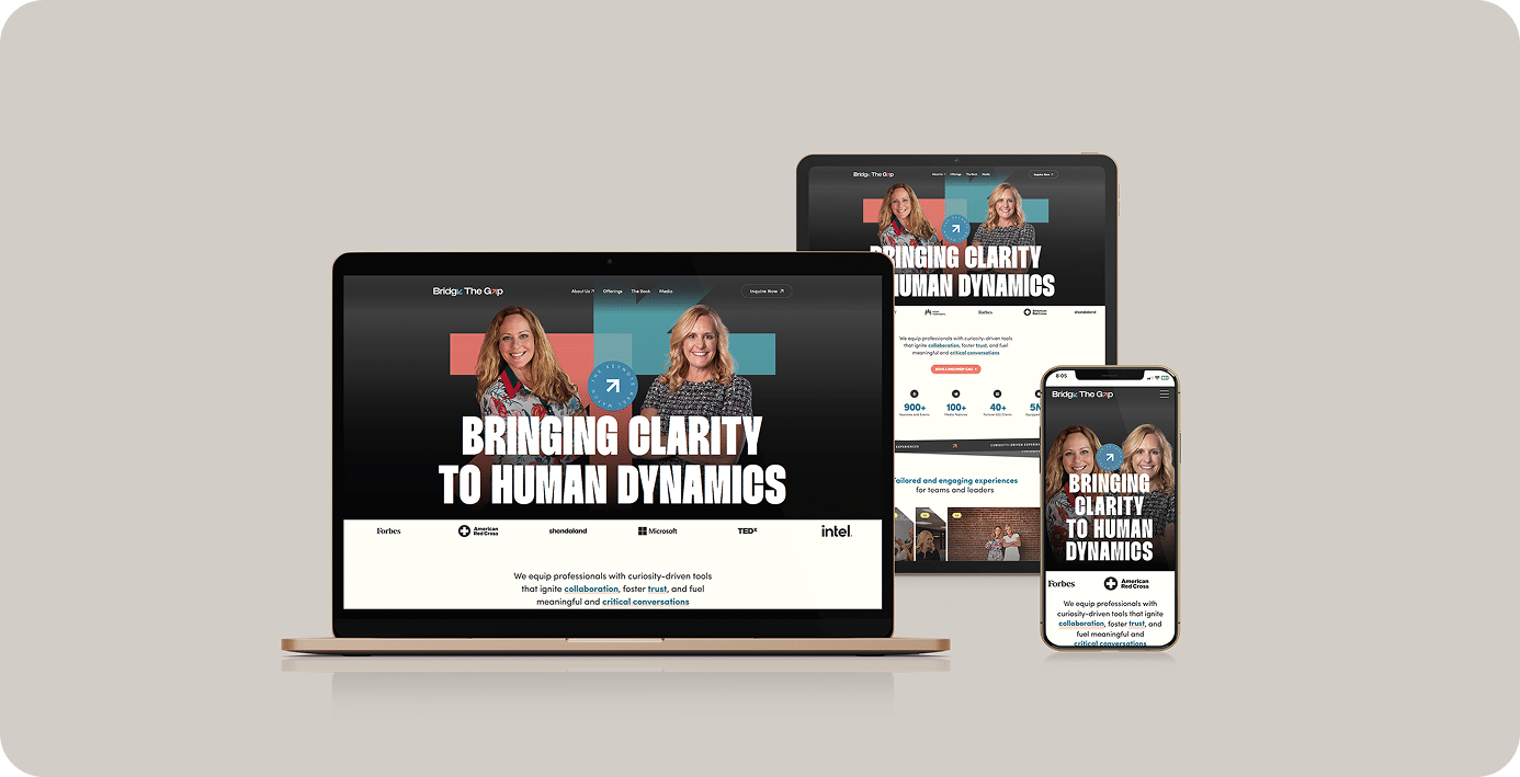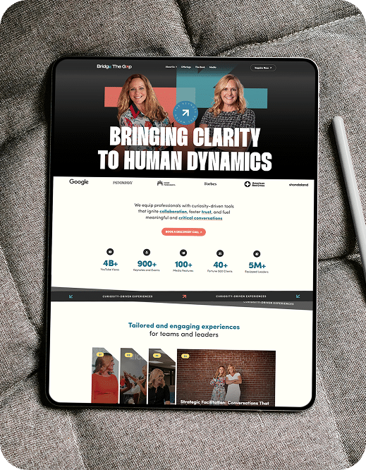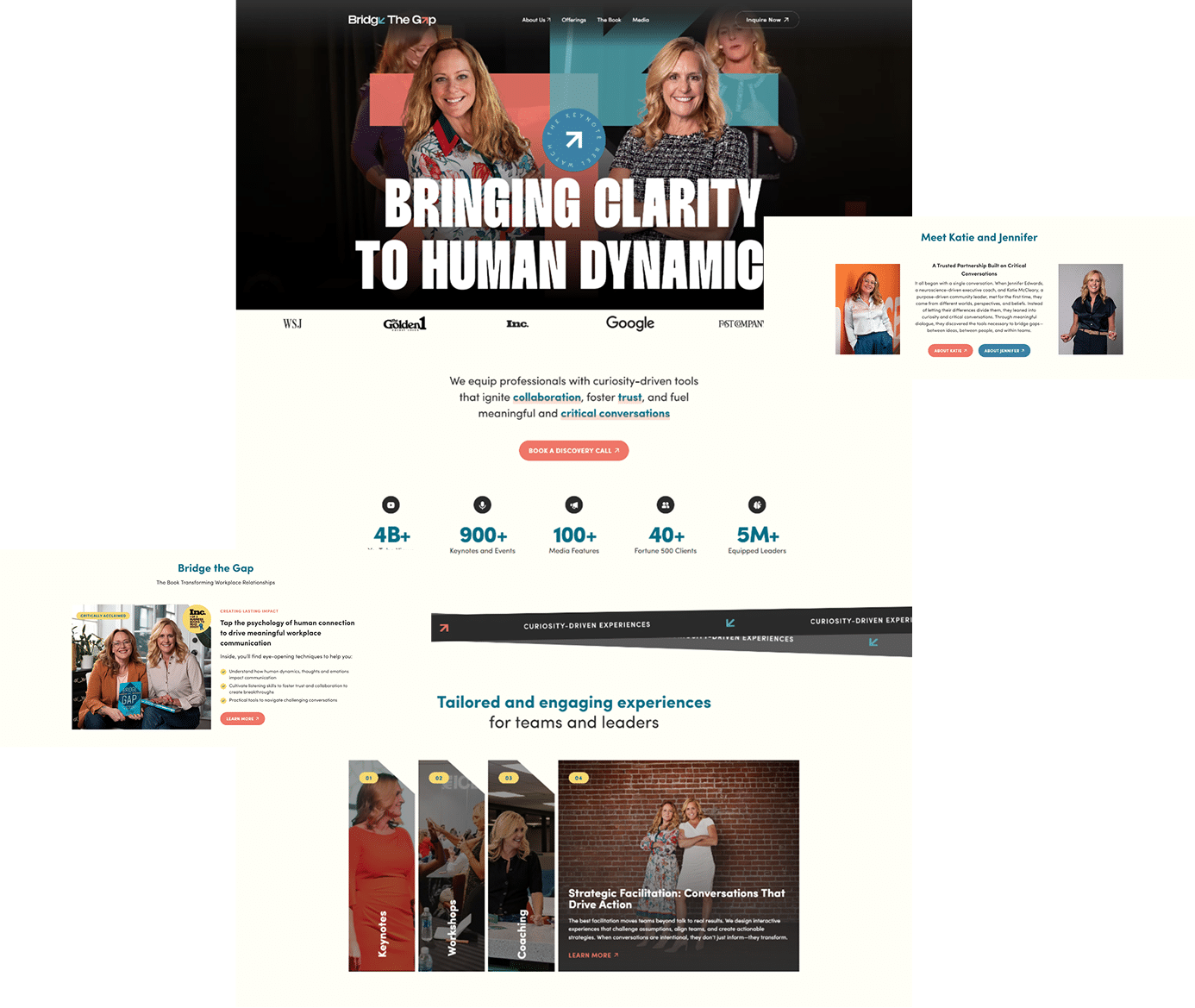 Bridge the Gap needed a unified brand that balanced their joint identity with their individual voices. At the same time, the site had to clearly present four distinct offerings — Keynotes, Workshops, Coaching, and Strategic Facilitation — in a way that helped busy decision-makers act fast.